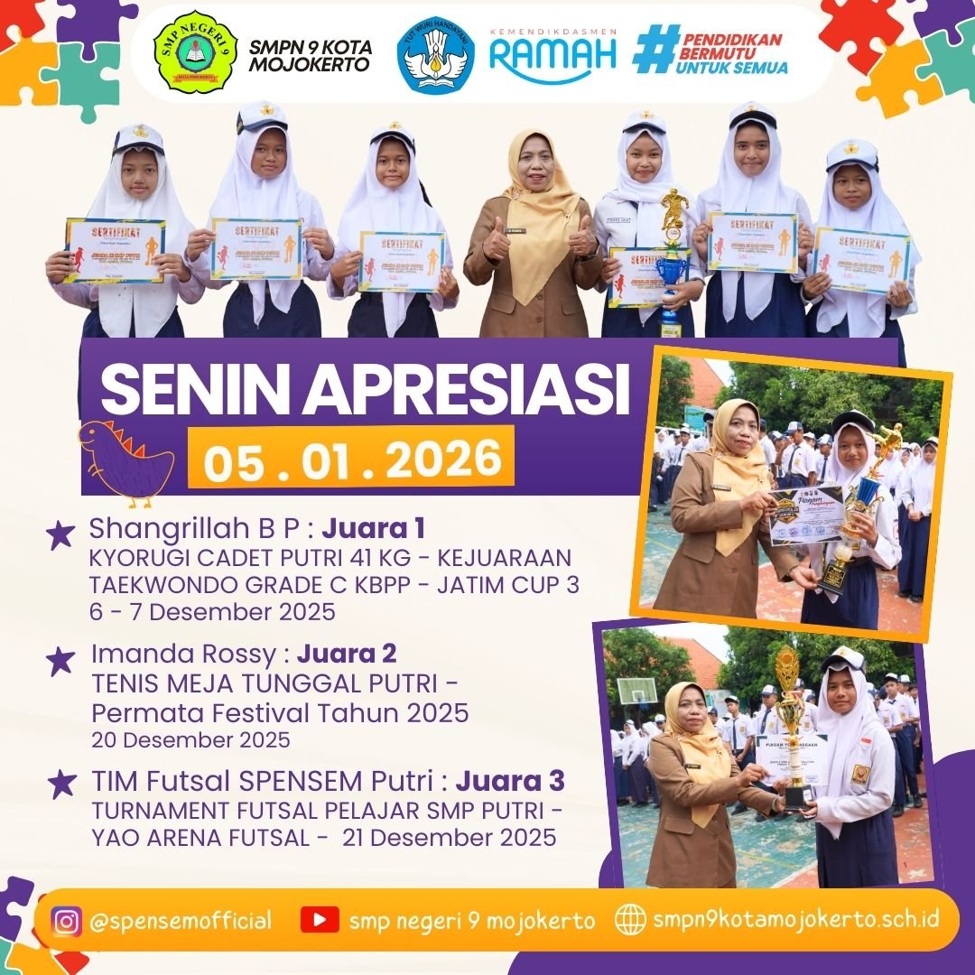 Keluarga besar SMP Negeri 9 Kota Mojokerto mengucapkan selamat dan apresiasi setinggi-tingginya kepada para siswa berprestasi yang telah mengharumkan nama sekolah di berbagai ajang kompetisi diantaranya sebagai berikut.